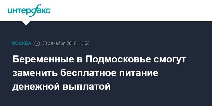 Москва. 20 декабря. INTERFAX.RU - Возможность предоставления вместо бесплатного питания денежной выплаты будет предоставлена беременным и кормящим женщинам в Московской области. Соответствующий закон в третьем чтении приняли депутаты Мособлдумы в четверг.