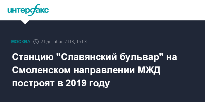 Москва. 21 декабря. INTERFAX.RU - Станцию "Славянский бульвар" планируется построить в 2019 году на Смоленском направлении Московской железной дороги (МЖД), сообщил журналистам в пятницу заммэра столицы по вопросам градостроительной политики и строительства Марат Хуснуллин.