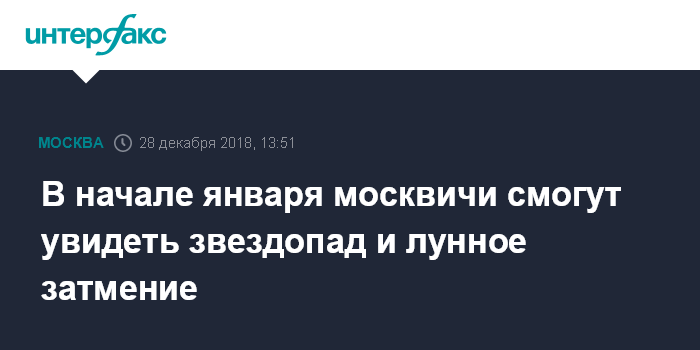Москва. 28 декабря. INTERFAX.RU - Звездный дождь и лунное затмение можно будет увидеть в Москве в начале 2019 года, своих пиков они достигнут 4 и 21 января, сообщает портал столичной мэрии.