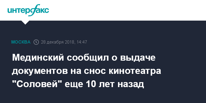 Мединский сообщил о выдаче документов на снос кинотеатра "Соловей" еще 10 лет назад
