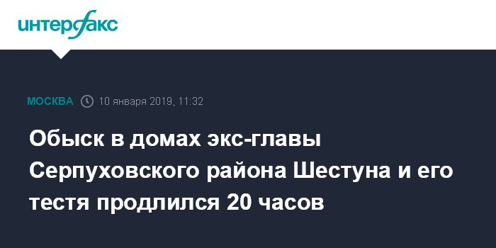 Москва. 10 января. INTERFAX.RU - Следователи почти сутки обыскивали дома бывшего главы Серпуховского района Московской области Александра Шестуна и его тестя, сообщила "Интерфаксу" в четверг супруга экс-чиновника Юлия Шестун.