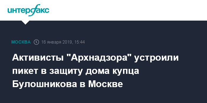 Москва. 16 января. INTERFAX.RU - Активисты движения "Архнадзор" организовали пикет у офиса компании-застройщика, планирующей надстройку исторического дома Булошникова на Большой Никитской улице, 17, стр. 1, передает корреспондент "Интерфакса" в среду.
