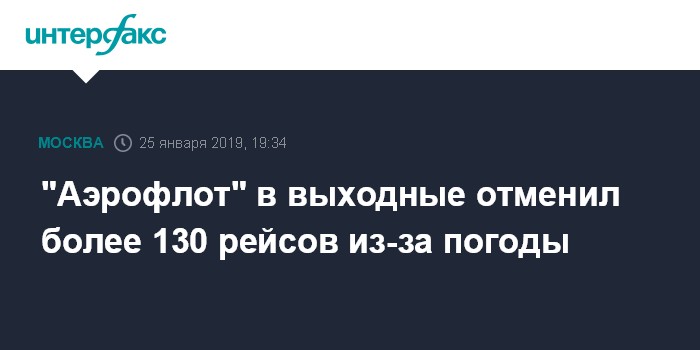 Москва. 25 января. INTERFAX.RU - "Аэрофлот" отменяет в эти выходные, 26 и 27 января, более 130 рейсов из московского аэропорта "Шереметьево" и обратно, сообщается на сайте перевозчика.