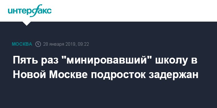 Москва. 28 января. INTERFAX.RU - Полиция задержала 15-летнего подростка, в течение месяца пять раз "минировавшего" школу в Новой Москве, сообщил "Интерфаксу" руководитель пресс-службы столичного главка полиции Юрий Титов.