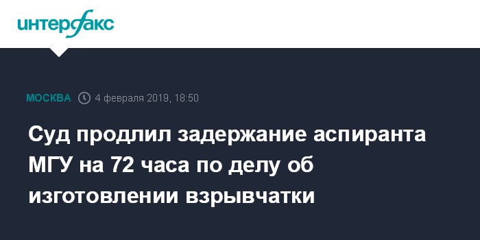 Суд продлил задержание аспиранта МГУ на 72 часа по делу об изготовлении взрывчатки