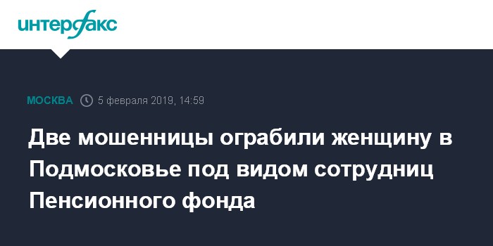 По данным полиции, две женщины под видом работниц Пенсионного фонда проникли в квартиру к 84-летней жительнице Одинцово и сообщили о необходимости написать заявление якобы для замены пенсионного удостоверения на документ нового образца. Мошенницы отвлекли внимание пенсионерки и похитили ювелирные украшения, а также около 400 тысяч рублей.