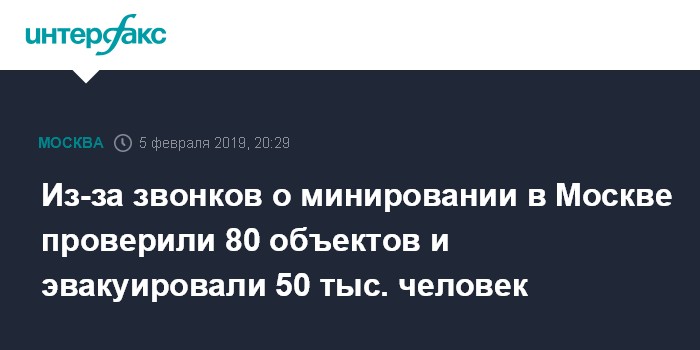 Он уточнил, что к 20:00 в Москве проверено порядка 80 объектов, для этого пришлось эвакуировать около 50 тысяч человек.