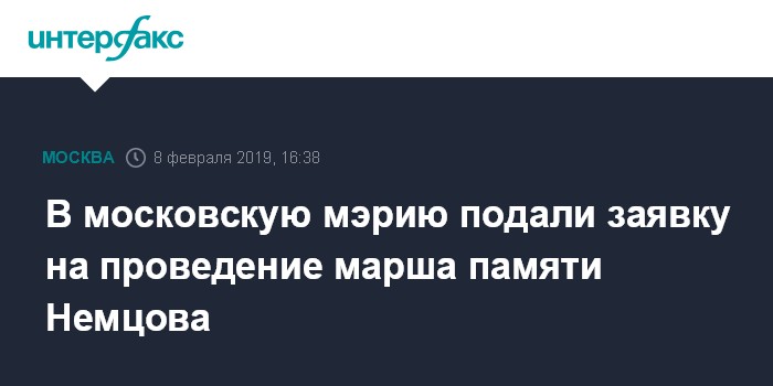 "Сегодня, 8 февраля, организаторы подали в правительство Москвы официальное уведомление о проведении марша Немцова. Марш запланирован на 24 февраля в центре города по сегменту бульварного кольца и проспекту Академика Сахарова", - сказали "Интерфаксу" в движении.