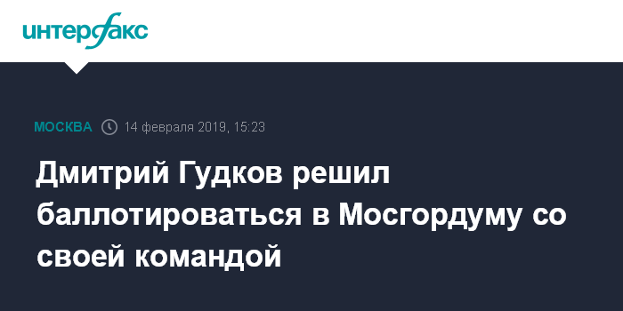 Москва. 14 февраля. INTERFAX.RU - Председатель партии "Гражданская инициатива" Дмитрий Гудков объявил о намерении баллотироваться на выборах в Мосгордуму, вместе с ним на депутатские мандаты претендуют еще семь членов из его команды.