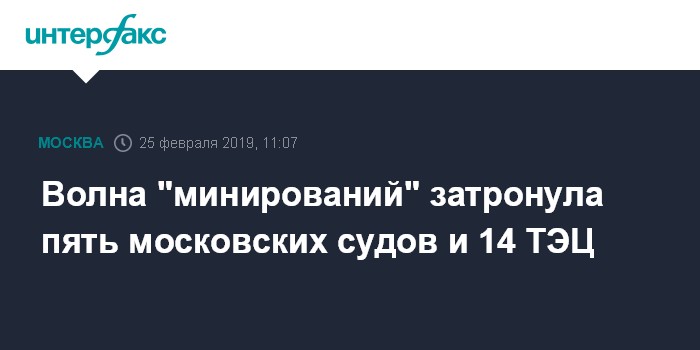 "Волна "минирований" началась около 10:00. К 11:00 поступили анонимные сообщения об угрозе взрыва пяти зданий московских судов и 14 городских ТЭЦ", - сказал собеседник агентства.