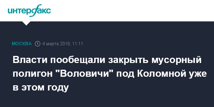 "В 2019 году по поручению Андрея Воробьева (губернатора Московской области - ИФ) мы закрываем полигон "Воловичи" и приступаем к его рекультивации", - говорится в отчете главы Коломенского городского округа Дениса Лебедева, копия которого имеется в распоряжении "Интерфакса".