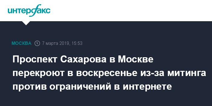 Москва. 7 марта. INTERFAX.RU - В связи с проведением в воскресенье в центре Москвы митинга против ограничений в интернете проспект Академика Сахарова и улицу Маши Порываевой (продолжение проспекта Академика Сахарова) закроют для движения автомобилей, сообщили "Интерфаксу" в пресс-службе Центра организации дорожного движения в четверг.
