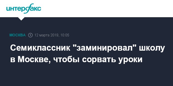 Москва. 12 марта. INTERFAX.RU - Желавший сорвать уроки семиклассник стал причиной эвакуации 1,5 тыс. человек из школы на юго-западе Москвы, сообщил "Интерфаксу" во вторник информированный источник.