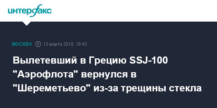 "Следователи устанавливают обстоятельства и причины ЧП с самолетом SSJ-100 компании "Аэрофлот" сообщением Москва - Салоники. Пилоты вынуждены были вернуться в "Шереметьево" из-за растрескивания верхнего слоя лобового стекла", - сообщили "Интерфаксу" в среду в пресс-службе Следственного комитета (СК).