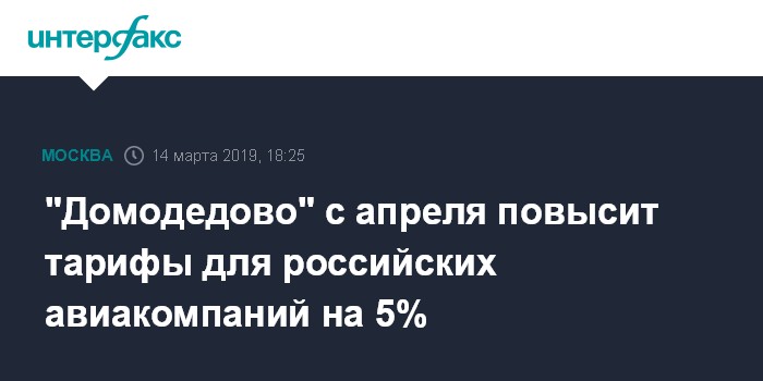 Москва. 14 марта. INTERFAX.RU - Московский аэропорт "Домодедово" с 1 апреля 2019 года повысит основные тарифы на обслуживание российских авиакомпаний, индексация составит в среднем 5%, следует из материалов аэропорта.