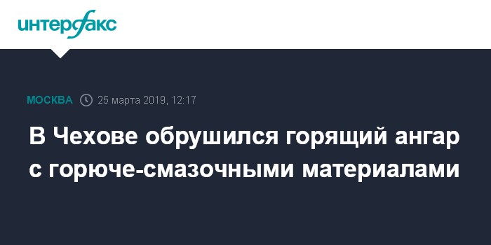 Москва. 25 марта. INTERFAX.RU - В подмосковном Чехове обрушился ангар с горюче-смазочными материалами, загоревшийся в понедельник утром, сообщает МЧС.