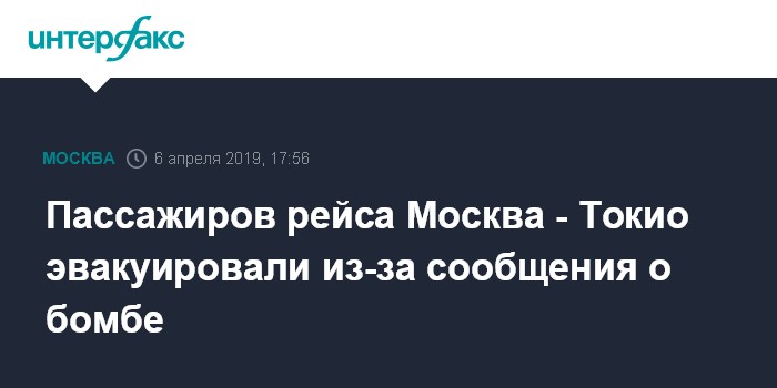 Москва. 6 апреля. INTERFAX.RU - Рейс Москва - Токио пришлось эвакуировать перед вылетом из московского аэропорта "Домодедово" после анонимного сообщения о якобы заложенной в самолете бомбе, сообщил "Интерфаксу" в субботу информированный источник.