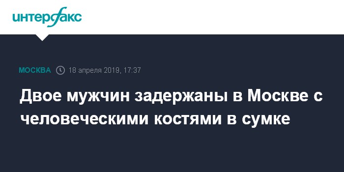 Москва. 18 апреля. INTERFAX.RU - Полицейские задержали на востоке Москвы двоих мужчин с останками скелета человека в сумке, сообщила представитель столичного главка Следственного комитета (СК) Юлия Иванова.