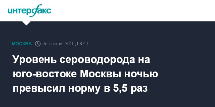 Москва. 25 апреля. INTERFAX.RU - Измерительные станции "Мосэкомониторинга" в ночь на четверг зафиксировали превышение допустимой концентрации (ПДКм.р.) сероводорода в нескольких районах юго-востока столицы.