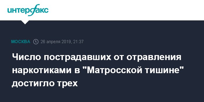 Москва. 26 апреля. INTERFAX.RU - Число отравившихся наркотиками арестантов СИЗО-1 "Матросская тишина" увеличилось до трех, сообщила представитель столичного главка Следственного комитета (СК) Юлия Иванова.