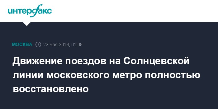 Москва. 22 мая. INTERFAX.RU - Движение поездов на участке Солнцевской линии столичного метро, прерванное около 18:45 вторника из-за застрявшего в тоннеле поезда между станциями "Шелепиха" и "Хорошевская", полностью восстановлено в ночь на среду.