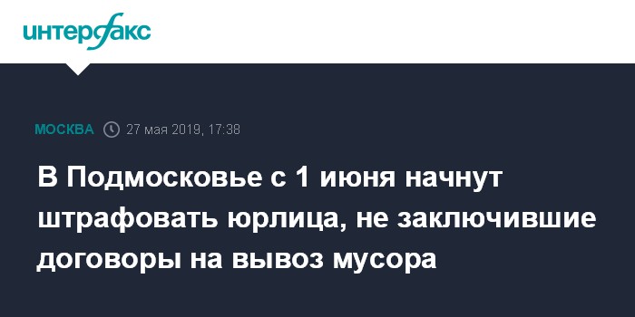 Москва. 27 мая. INTERFAX.RU - С 1 июня в Московской области начнутся масштабные проверки наличия договоров на вывоз мусора у юридических лиц, нарушителей ждут штрафы до 250 тысяч рублей, сообщил вице-губернатор Московской области Дмитрий Пестов.