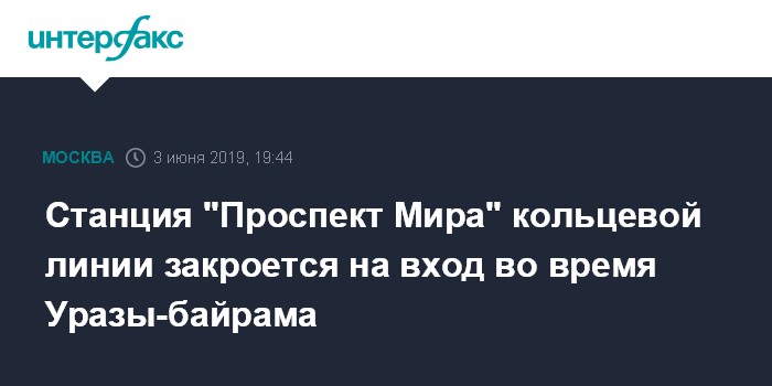 Москва. 3 июня. INTERFAX.RU - Празднование Уразы-байрама внесет изменения в режим работы одной из двух станций "Проспект Мира". Об этом сообщили "Интерфаксу" в пресс-службе столичного метрополитена в понедельник.