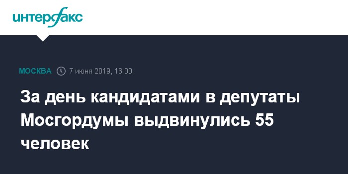 Москва. 7 июня. INTERFAX.RU - В первый день приема документов окружными избирательными комиссиями кандидатами в депутаты Мосгордумы выдвинулись 55 человек, сообщили "Интерфаксу" в Мосгоризбиркоме в пятницу.