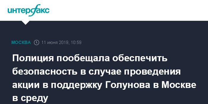 Москва. 11 июня. INTERFAX.RU - Полиция готова обеспечить безопасность в центре Москвы, где в среду может состояться акция в поддержку журналиста Ивана Голунова, заявил на пресс-конференции в центральном офисе "Интерфакса" в Москве представитель МВД Станислав Колесник.