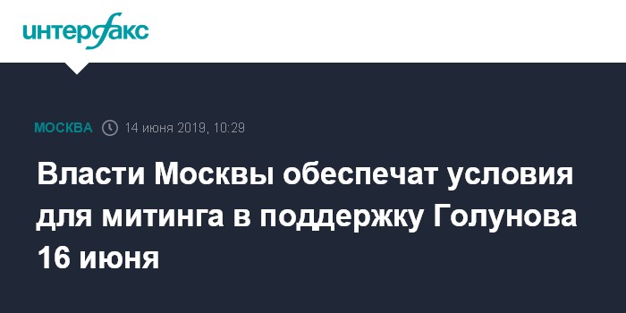 Москва. 14 июня. INTERFAX.RU - Столичные власти предпримут необходимые меры для проведения согласованного митинга 16 июня на проспекте Академика Сахарова в поддержку журналиста "Медузы" Ивана Голунова, освобожденного от ответственности после снятия обвинений в покушении на сбыт наркотиков.