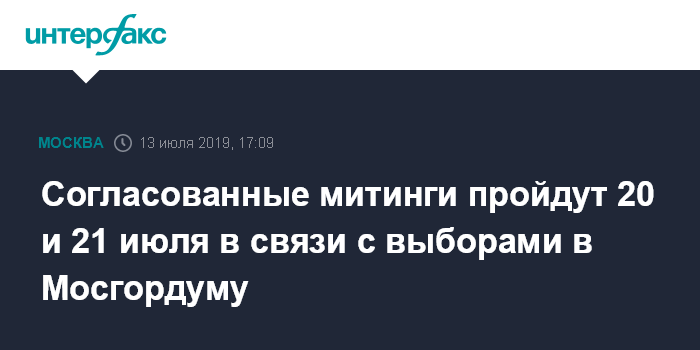 Москва. 13 июля. INTERFAX.RU - Правительство Москвы согласовало запланированные на выходные 20 и 21 июля два митинга на проспекте Сахарова, посвященные предстоящим выборам в Мосгордуму, сообщил "Интерфаксу" Василий Олейник - первый замглавы столичного департамента региональной безопасности и противодействия коррупции.