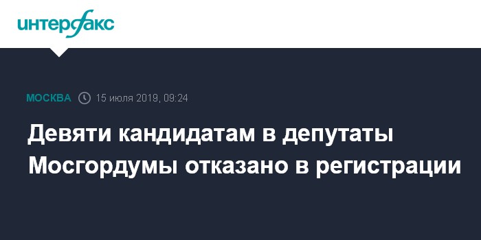 Москва. 15 июля. INTERFAX.RU - Мосгоризбирком отказал в регистрации девяти кандидатами в депутаты Мосгордумы, заявил в понедельник председатель комиссии Валентин Горбунов.