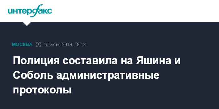 Москва. 15 июля. INTERFAX.RU - Столичные полицейские составили административные протоколы в отношении оппозиционеров Ильи Яшина и Любови Соболь, задержанных накануне на митинге.