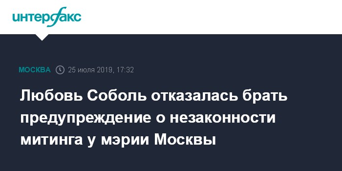 Москва. 25 июля. INTERFAX.RU - Полицейские пытались передать предупреждение прокурора юристу Любови Соболь, получившей отказ в регистрации кандидатом в депутаты Мосгордумы, насчет незаконности планируемого митинга.