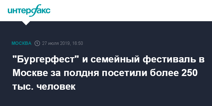 Москва. 27 июля. INTERFAX.RU - Только в первой половине дня субботы День бургера в парке Горького и семейный фестиваль на территории ВДНХ посетили более 250 тысяч человек.