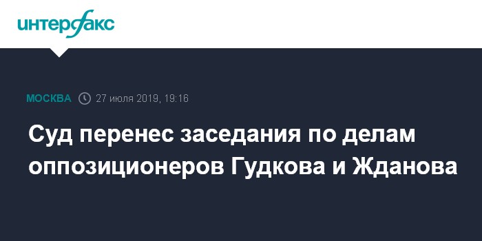 Москва. 27 июля. INTERFAX.RU - Коптевский суд Москвы перенес рассмотрение административного дела незарегистрированных кандидатов в Мосгордуму Дмитрия Гудкова и Ивана Жданова за организацию акции оппозиции 27 июля.