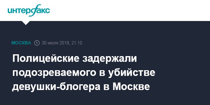 Москва. 30 июля. INTERFAX.RU - Полиция задержала подозреваемого в убийстве девушки-блогера на западе Москвы. Об этом сообщила во вторник "Интерфаксу" официальный представитель МВД РФ Ирина Волк.