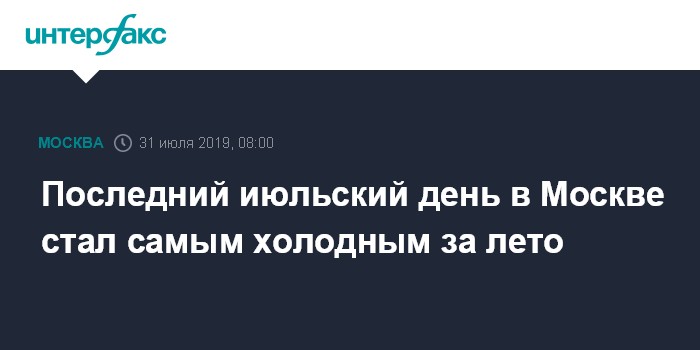 Москва. 31 июля. INTERFAX.RU - К 7:00 среды температура воздуха на базовой столичной метеостанции на ВДНХ опустилась до 8,3 градусов, что стало минимальным значением с начала календарного лета, сообщили "Интерфаксу" в метеобюро Москвы и области.