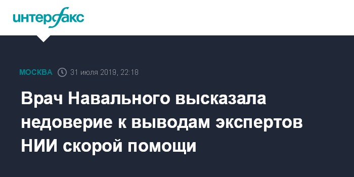 Москва. 31 июля. INTERFAX.RU - Не следует доверять выводам экспертов НИИ скорой помощи имени Склифосовского о том, что в организме Алексея Навального нет отравляющих веществ, они не собрали весь материал, необходимый для исследования, считает лечащий врач политика Анастасия Васильева.