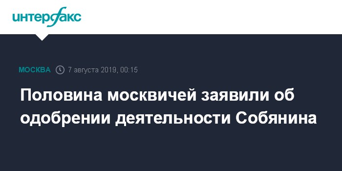 Москва. 7 августа. INTERFAX.RU - Почти половина жителей столицы (49%) положительно воспринимают деятельность действующего мэра Москвы Сергея Собянина, свидетельствуют данные опроса "Левада-центра", поступившие во вторник в "Интерфакс".