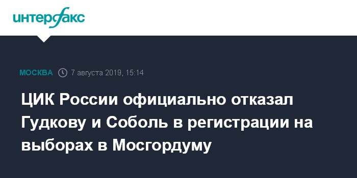 Москва. 7 августа. INTERFAX.RU - Центризбирком РФ официально отказал лидеру Партии перемен Дмитрию Гудкову (5-й округ) и юристу ФБК Любови Соболь (43-й округ) в регистрации кандидатами в Мосгордуму.