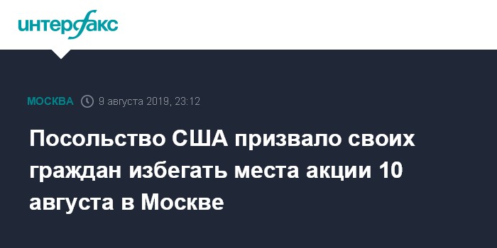 Москва. 9 августа. INTERFAX.RU - Посольство США в России в пятницу распространило предупреждение для находящихся в Москве американцев в связи с запланированным на субботу, 10 августа, митингом оппозиции на проспекте Сахарова.