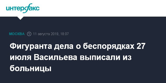 Москва. 11 августа. INTERFAX.RU - Подозреваемый по делу о беспорядках в Москве режиссер Дмитрий Васильев, который был госпитализирован из изолятора временного содержания, выписан в воскресенье из больницы.