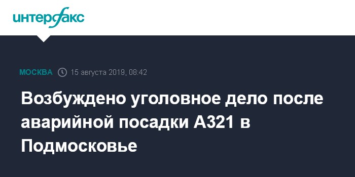 Москва. 15 августа. INTERFAX.RU - Уголовное дело возбуждено по факту аварийной посадки Airbus А321 в Раменском районе Подмосковья. Об этом сообщила представитель столичного управления на транспорте Следственного комитета России (СКР) Елена Марковская.