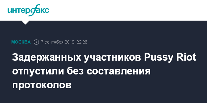 Москва. 7 сентября. INTERFAX.RU - Правозащитная организация "Апология протеста" сообщает, что задержанных участников Pussy Riot и сообщества активистов и художников "Культраб" отпустили из ОВД без составления протокола.