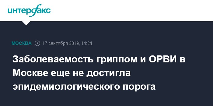 Москва. 17 сентября. INTERFAX.RU - В Москве за неделю с 9 по 15 сентября заболеваемость гриппом и респираторными вирусными заболеваниями по всем группам населения была ниже эпидемиологического порога на 33,6%. Об этом сообщило региональное управление Роспотребнадзора.