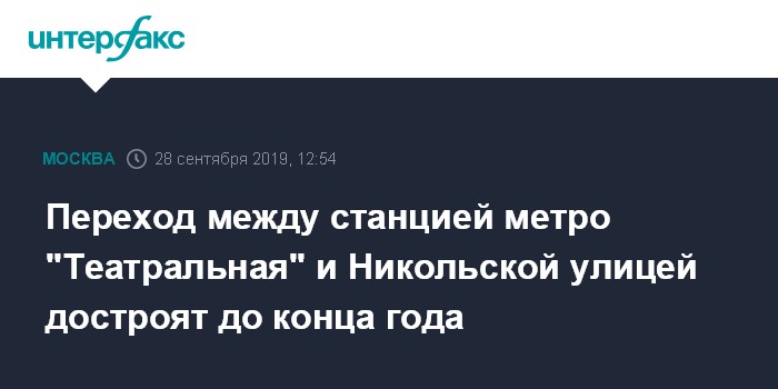 Москва. 28 сентября. INTERFAX.RU - Строительство подземного перехода между станцией метро "Театральная" и Никольской улицей планируется завершить к концу года, заявил заместитель мэра Москвы по вопросам градостроительной политики и строительства Марат Хуснуллин.