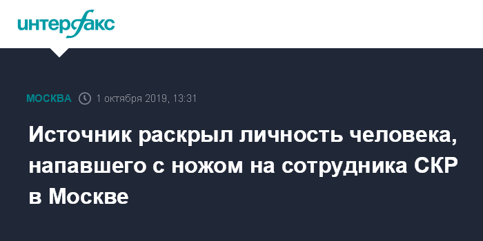 Москва. 1 октября. INTERFAX.RU - Напавший с ножом на сотрудника Следственного комитета РФ (СКР) в здании ведомства в Техническом переулке в Москве оказался 39-летним жителем Санкт-Петербурга, сообщил "Интерфаксу" информированный источник.