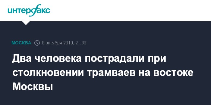 Москва. 8 октября. INTERFAX.RU - На востоке Москвы вечером во вторник столкнулись два трамвая, есть пострадавшие, сообщил "Интерфаксу" источник, знакомый с ситуацией.