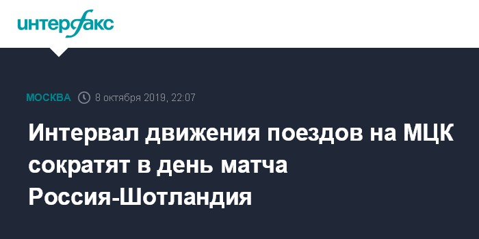 Москва. 8 октября. INTERFAX.RU - Интервал между "Ласточками" на Московском центральном кольце (МЦК) сократят до пяти минут 10 октября для перевозки болельщиков футбольного матча между сборными России и Шотландии, поезда будут ездить до до 01:00, сообщается на сайте Московской железной дороги во вторник.